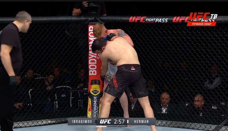 Первый раунд. Ибрагимов очень быстро полез в агрессивную атаку на опытного соперника. Ибрагимов, как и в своем первом бою, в очень энергозатратной манере работает. Американец очень много отвечает коленями. Рассек бровь россиянину. Оверхэндом под конец раунда попал Ибрагимов, но в целом прилично устал уже.