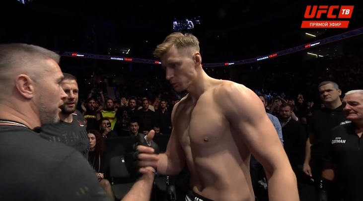 Первый раунд. Под скандирование «Россия! Россия!» проходил первый раунд. Прилично поработали оба бойца. Тренеры в углу каждому говорят, что нужно быть активнее и внимательнее в комбинациях.
