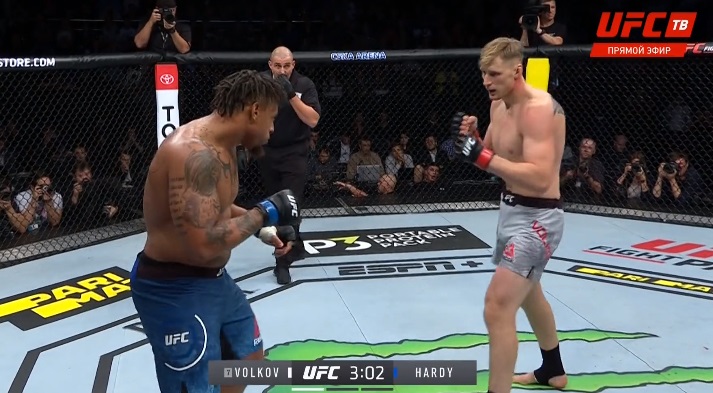 Третий раунд. Волков начал с хайкика в челюсть, а затем уже Харди полетел. Американцу нужен нокаут. В середине пятиминутки 63 на 32 было преимущество у Волкова по значимым ударам. Харди периодически прилично попадал, но Александр делал то же самое чаще. Бодрая концовка с большим количеством ударов. Волков не повторил старых ошибок, уверенно доработав и не пропустив решающего удара.