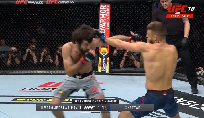 Первый раунд. Начало было достаточно осторожным, Кэттер даже работал первым номером, но постепенно Магомедшарипов забрал инициативу и нанес много неприятных ударов, особенно ногами. Раунд за россиянином.