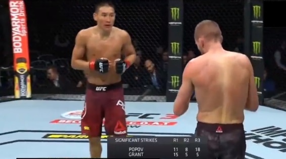 Не хватает сил уже Дэви Гранту. Пытался он дожать Попова, но тот сохранил больше сил и работает поинтереснее сейчас! Если в первом раунде проиграл по значимым ударам, а во втором победил, то в третьем просто громит соперника!