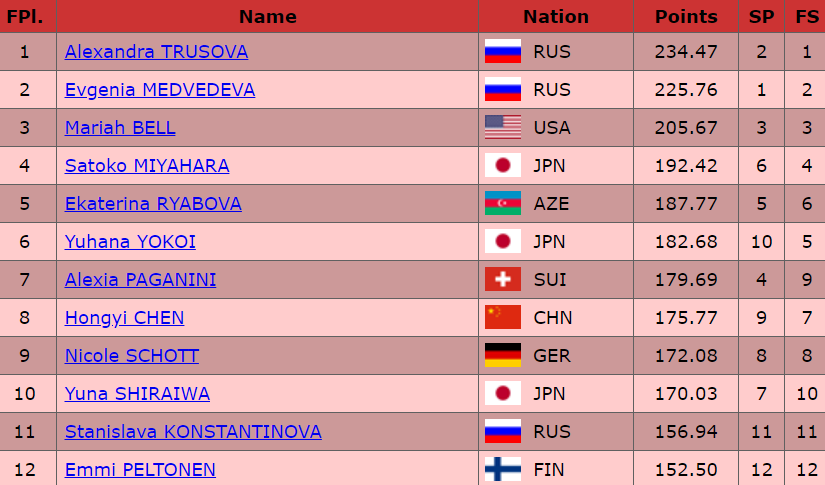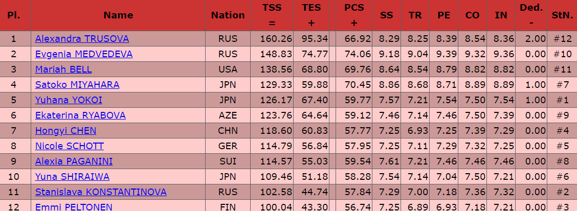 Подведем итоги. Сначала с печального. Станислава Константинова не смогла побороться за медали этапа и заняла предпоследнюю строчку. Евгения Медведева показала восхитительный прокат, доказала всем, что она способна бороться за высокие места и заняла вторую строчку. А вот Александра Трусова, русская ракета, выиграла этап Гран-при и обеспечила себе место в финале Гран-при.