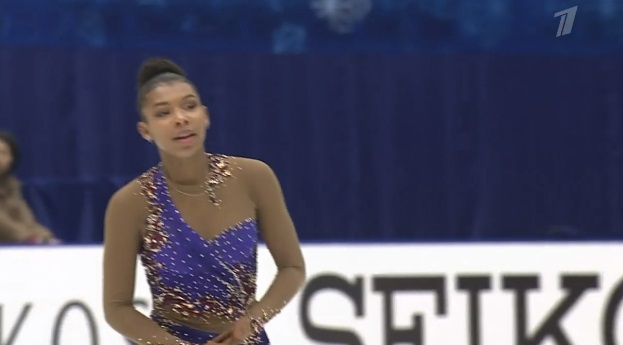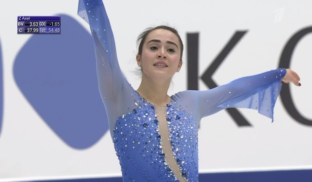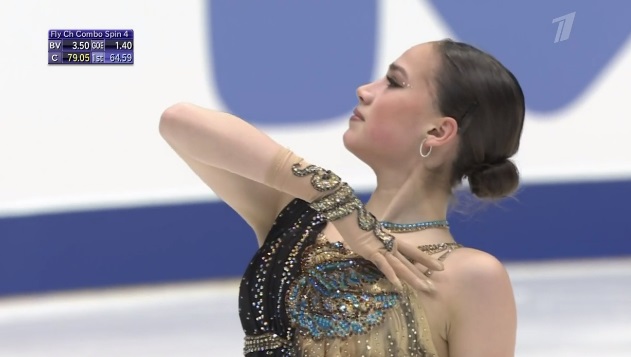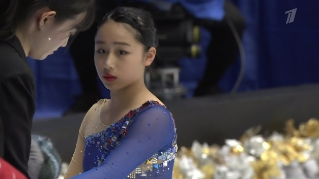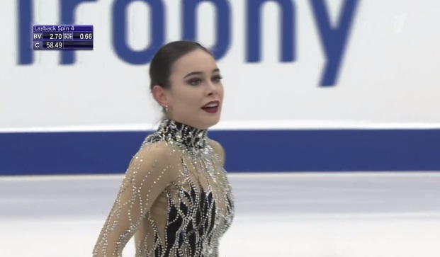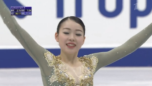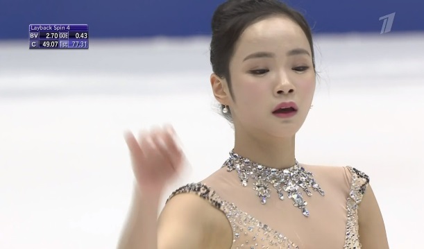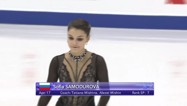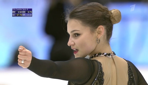 Упала на втором прыжке в каскаде из двух тройных тулупов, сделала тройной флип, двойной аксель, тройной лутц. Во второй части программы были каскад 3 риттбергер — 2 тулуп, каскад 2 аксель — ойлер — 3 сальхов и тройной риттбергер с минусом за выезд. Завершили все вращения четвертого уровня, а дорожка была третьего уровня.