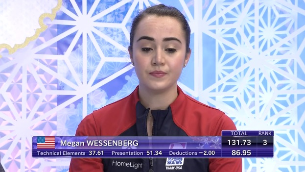 Вессенберг была последней с отрывом в короткой программе. В произвольной старалась. Прыгала тройной тулуп, тройной сальхов, каскад 3 тулуп — 2 тулуп — 3 риттбергер у нее получился, но в целом, конечно, уровень слабый.