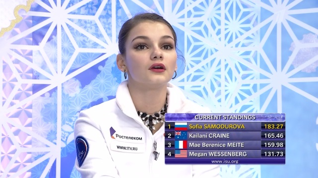 1. Алена Косторная (Россия) – 85,04 2. Рика Кихира (Япония) – 79,89 3. Карен Чен (США) – 67,21 4. Алина Загитова (Россия) – 66,84 5. Мако Ямашита (Япония) – 65,70 6. Лим Ын Су (Южная Корея) – 65,28 7. Софья Самодурова (Россия) – 63,85 8. Юхана Йокои (Япония) – 62,67 9. Старр Эндрюс (США) – 58,92 10. Кайлани Крейн (Австралия) – 55,82 11. Мэ Беренис Мейте (Франция) – 49,77 12. Меган Вессенберг (США) – 44,78