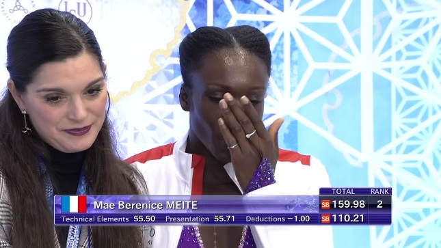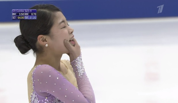 Тройной лутц в начале программы и сразу падение. Тройной риттбергер тоже неудачным вышел. Каскад тоже не вышел — третий прыжок не сделала. Ну хоть с двойным акселем справилась. Тройной сальхов сделала, каскад 3 флип — 2 тулуп — тоже. Но уже все элементы пошли с минусами. Без настроения катается кореянка и на каскаде упала во второй части с первого прыжка (тройного лутца). В общем, полный провал. Плачет Ын Су Лим.