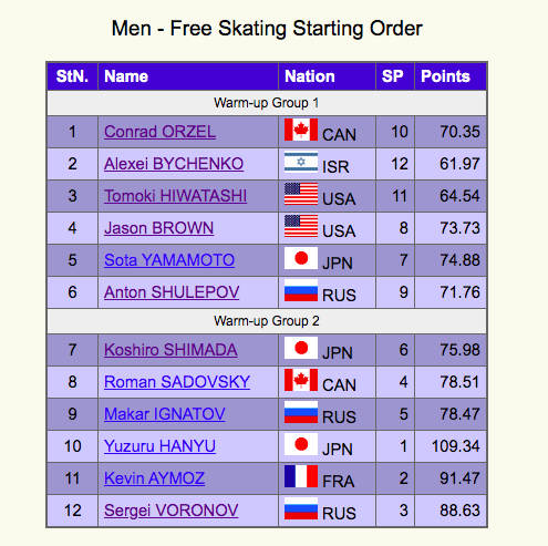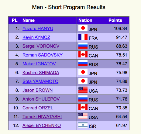 По итогам короткой программы на первом месте расположился, конечно, японец Юдзуру Ханю. На втором — француз Кевин Аймо, на третьем — россиянин Сергей Воронов.