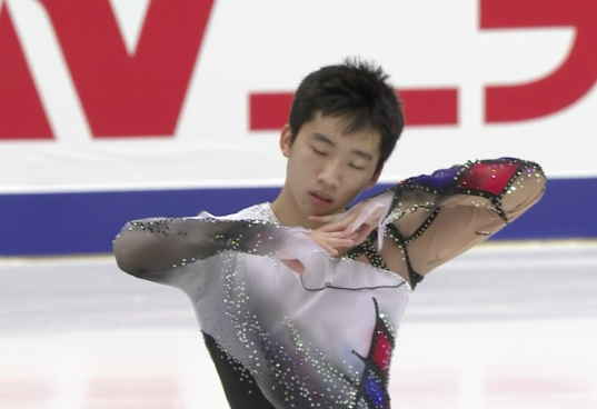Итак, самым первым элементом Хиваташи показал четверной тулуп, хотя должен был делать каскад с тройным. Надо будет добавлять теперь прыжок к другому, чтобы не потерять каскад.