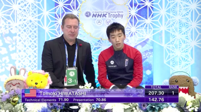 Быченко саркастически высовывает язык сразу после финальной позы — явно недоволен своим выступлением. 31-летний спортсмен говорит своему наставнику, что сам не понял, почему допустил такие ошибки. Тем не менее японская публика провожает его оглушительными аплодисментами — уважает опытного фигуриста.