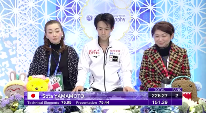 Ошибки у японца чередуются с шикарным исполнением. После отличного четверного тулупа последовал тройной аксель с приземлением сразу на две ноги и заваленным выездом. Тем не менее Ямамото не падает, борется за каждый элемент.
