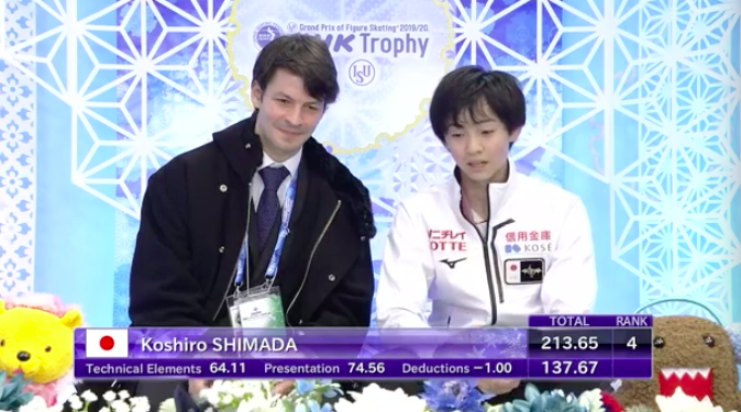 А ведь изначально планировал еще и четверной тулуп в концовке делать, но, конечно, не стал. Вместо него выполнил каскад тройной лутц + тройной тулуп, чтобы восполнить потерю баллов от четверного. К тому же много недокрутов у Шимады, кажется.