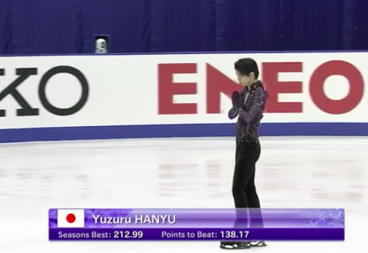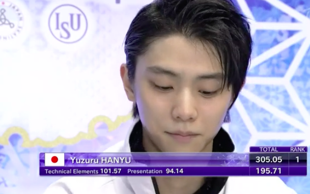 Ханю начинает на ходу переделывать программу, чтобы добрать баллы. Неожиданно исполняет каскад четверной тулуп + тройной тулуп, а затем тройной аксель + ойлер + тройной сальхов.