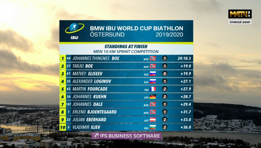 Что ж, подводим итоги. Йоханнес Бе без проблем выигрывает гонку и подтверждает статус лидера сезона. Вторым пришел к финишу его брат Тарьей Бе. А вот третьим сенсационно к финишу пришел россиянин Матвей Елисеев, уступив 0,9 секунды Бе-старшему. Александр Логинов — только четвертый, это неплохо для набора формы. Так или иначе, хорошая гонка для наших биатлонистов.