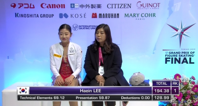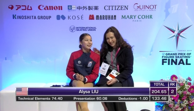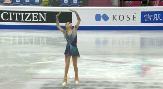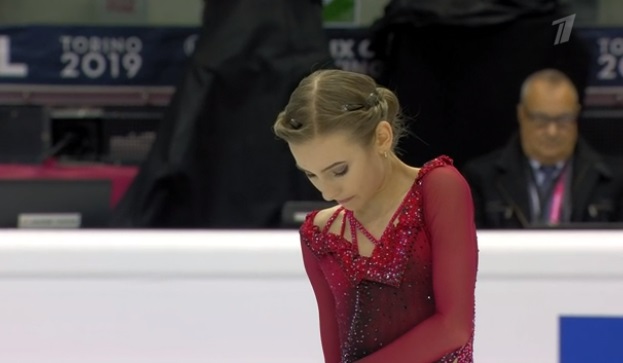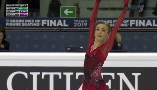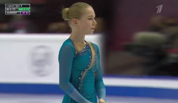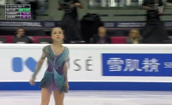 Сразу же падает с тройного акселя, зато четко исполняет каскад 4 лутц — 3 тулуп. С ошибкой приземляет сольный четверной лутц, затем делает каскад 3 аксель — 2 тулуп и вращается на четвертый уровень, завершая первую часть программы. Во второй части следует дорожка шагов четвертого уровня, тройной риттбергер, каскад 3 лутц — ойлер — 3 сальхов, тройной флип и два вращения на четвертый уровень! Сложность просто потрясающая. Конечно, Алиса станет лидером, хоть и допустила ошибки. Как жаль, что Камила Валиева сломала ногу по ходу этого сезона и не смогла выдать весь свой арсенал в финале.