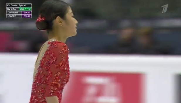 Сразу же каскад 3 лутц — 3 тулуп задал тон выступлению. Последовал чистый тройной риттбергер, потом классно сделала тройной флип и двойной аксель. Повращалась на четвертый уровень, и пошла вторая часть проката. Там сразу же каскад 2 аксель — 3 тулуп, каскад 3 флип — 2 тулуп — 2 риттбергер, тройной сальхов — все в целом чисто. Затем вращение четвертого уровня, дорожка шагов четвертого уровня и финальное вращение тоже четвертого! Прекрасный прокат! Васильеву обыграет, конечно!