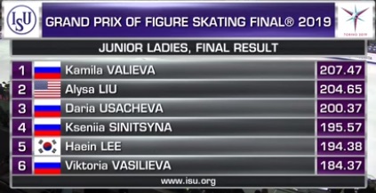 СоцсетиВот таким, счастливым для нас и конкретно Камилы Валиевой получился финал юниорского Гран-при! Но и бронзу Дарьи Усачевой отметим. Спасибо, что были с нами и до новых встреч. Трансляцию вел Александр Седов.