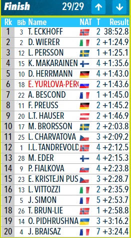Мяккарайнен прибегает четвертой, пятой становится Дениза Херрманн, которая выигрывает 0,6 секунды у ставшей шестой Юрловой-Перхт! Отличная гонка Екатерины! Лучшая для нее в сезоне!
