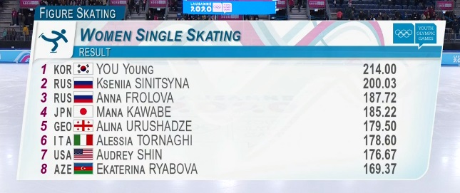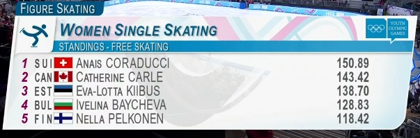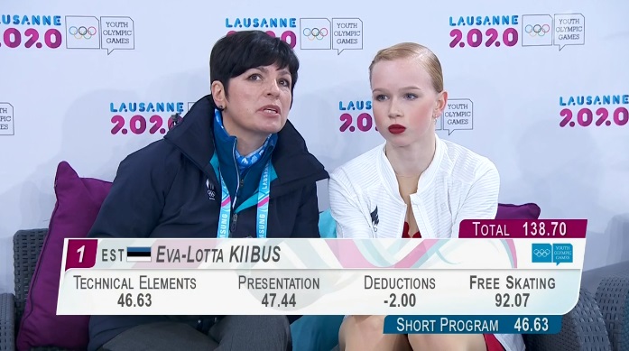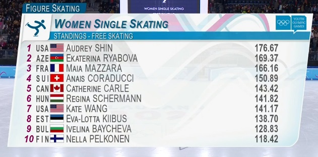 Положение после короткой программы: 1. Ю Ен (Южная Корея) – 73,51 2. Ксения Синицына (Россия) – 71,77 3. Анна Фролова (Россия) – 69,07 4. Мана Кавабе (Япония) – 65,84 5. Алина Урушадзе (Грузия) – 63,10 6. Алесса Торнаги (Италия) – 62,19... 9. Екатерина Рябова (Азербайджан) – 59,30... 14. Ева Лотта Киибус (Эстония) – 46,63