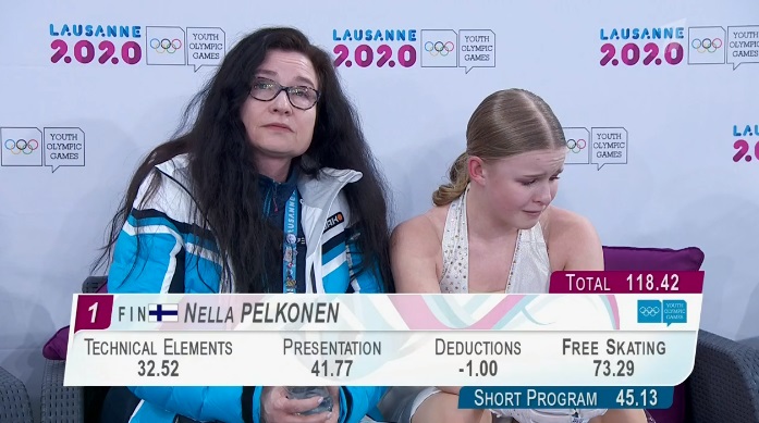 Сразу же все пошло не так, потому что Пелконен упала на первом же прыжке. После этого был еще целый ряд ошибок. Упала с риттбергера, не получилось сделать лутц, сальхов только двойным вышел, тройной риттбергер тоже не получилось сделать. Более менее вышло лишь с каскадами. В итоге выступление закончилось для 14-летней финки слезами.