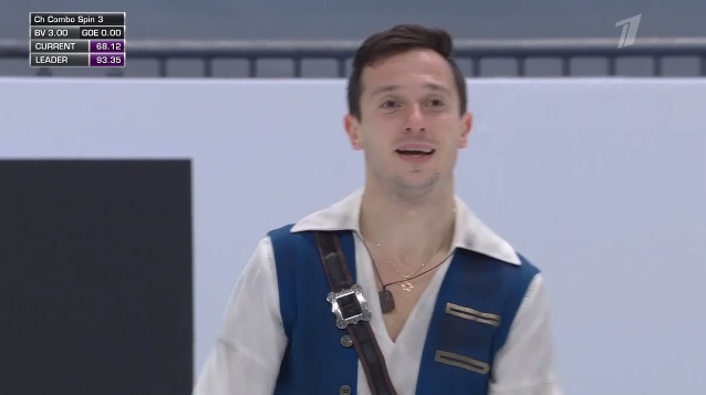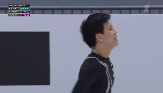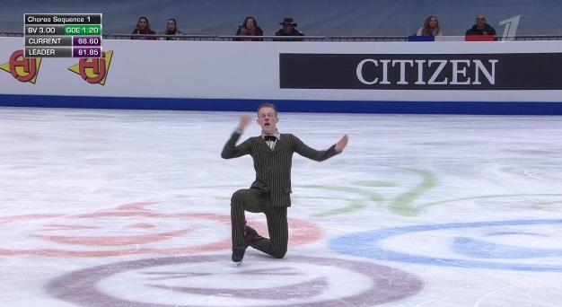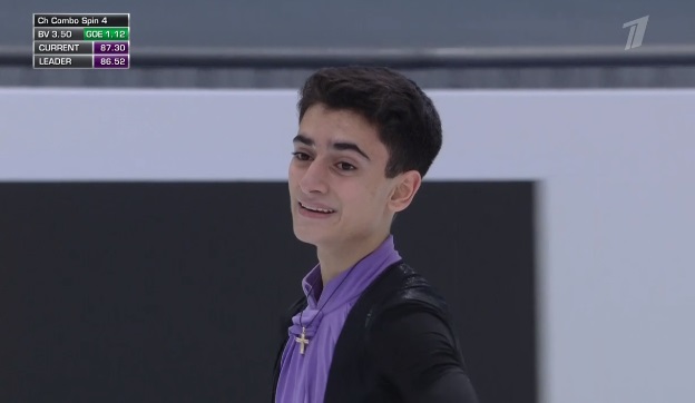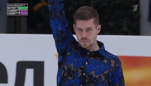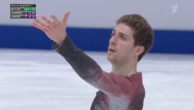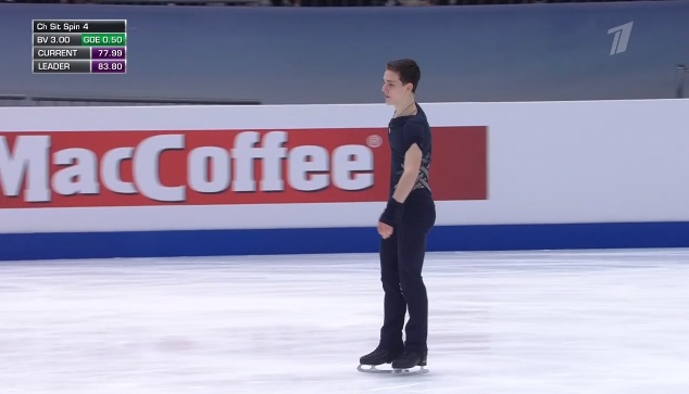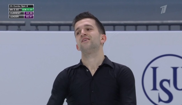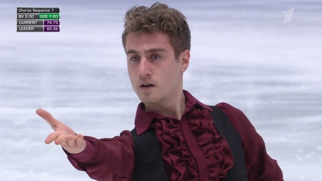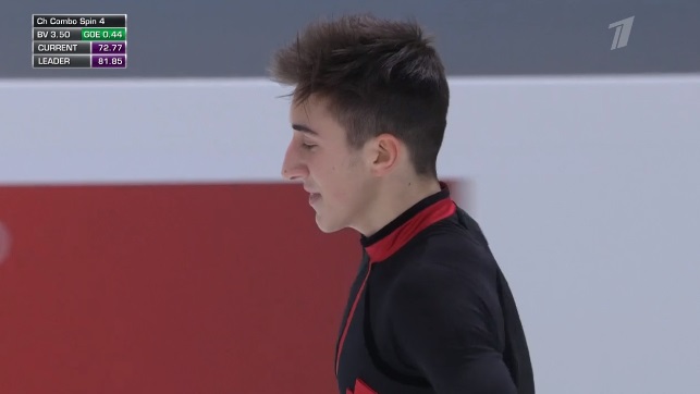 Стартует с каскад 4 сальхов — 2 тулуп, затем исполняет отличный тройной аксель, но падает на четверном сальхове. Во второй части проката сделал каскад 4-2 из тулупов, хотя второй явно должен был быть тройным. Каскад 3 флип — ойлер — 3 сальхов и сольный тройной флип вышли удачными. Мог быть абсолютно лучший прокат на сегодня, а так Грасслю по технике проигрывает.