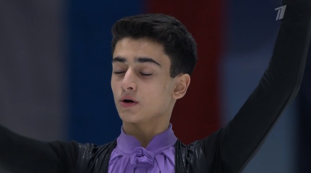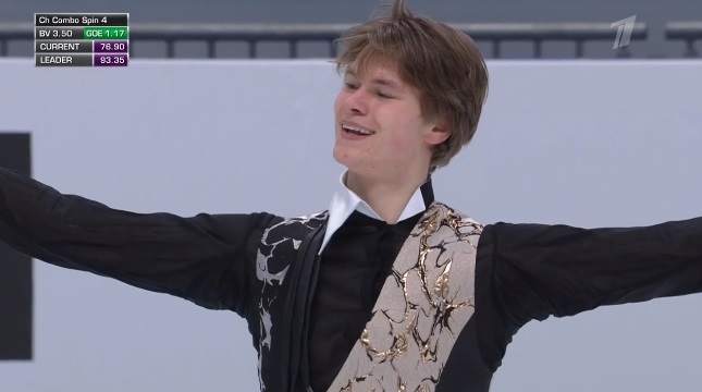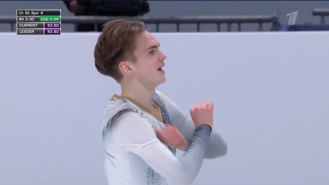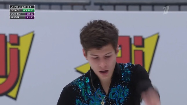 Начал сразу же с тройной акселя, затем каскад 3 аксель — 2 тулуп, и тоже чисто. Следом тройной лутц, потом тройной флип. Во второй части проката сделал дорожку шагов третьего уровня, подпортил каскад 3 сальхов — ойлер — 2 сальхов и каскад из двух двойных акселя и не сделанного третьего прыжка. Да и тройной тулуп не идеально прыгнул — подустал. Должен выйти в лидеры.