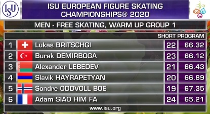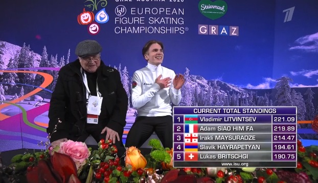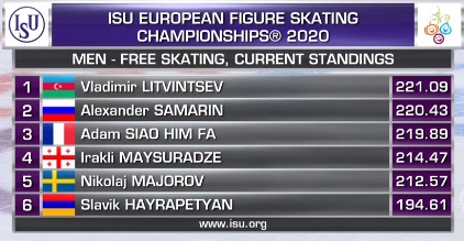 Итак, вот оценки Литвинцева. Он проигрывает Сяо Хим Фа в произвольной программе, но становится лидером соревнований по сумме!