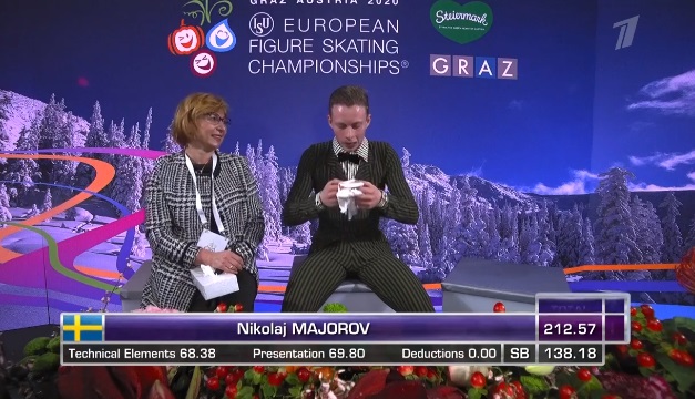 Вот оценки Майорова, у которого даже кровь носом пошла. Он занимает четвертое в произвольной и по сумме становится четвертым. Личный рекорд с запасом.