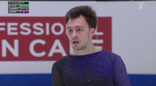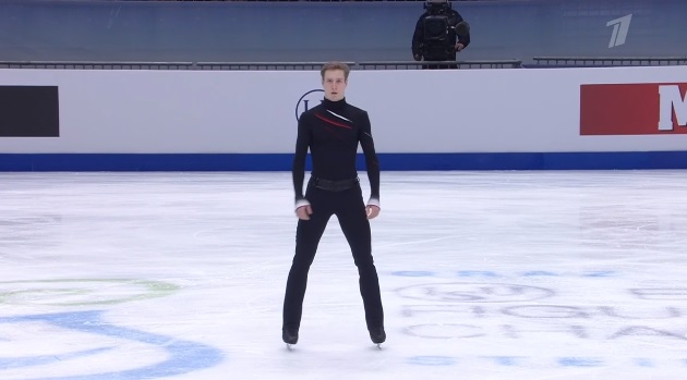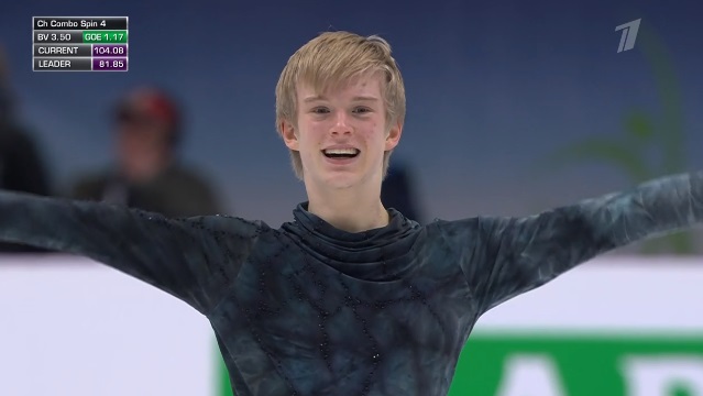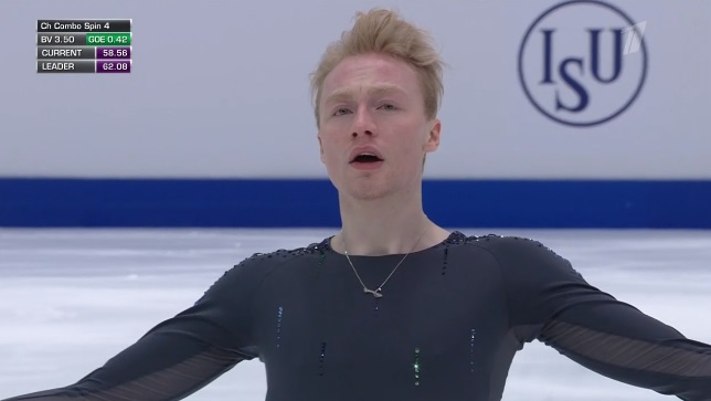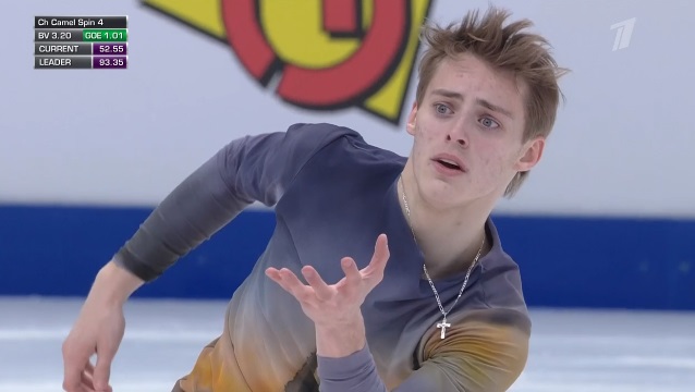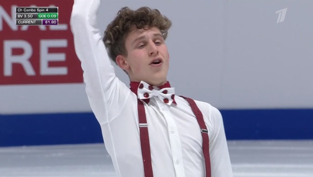 Начал с неплохого тройного флипа, дальше отборолся с каскадом 3 лутц — 3 тулуп и устоял после первого прыжка на выезде. А вот следующий каскад из 3-3 флип-тулуп превратился в 3-1. Каскад 2 аксель — ойлер — 2 сальхов сделал. Дорожка шагов на третий уровень. Во второй части программы в целом чисто сделал тройной сальхов, немного не докрутил тройной риттбергер, прыгнул без плюсов двойной аксель. Рабочий прокат, но явно не самый блестящий.