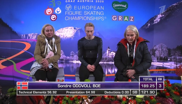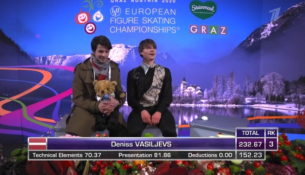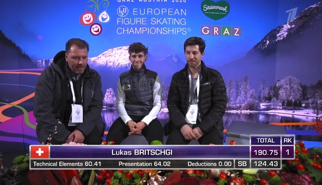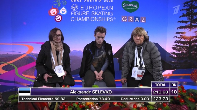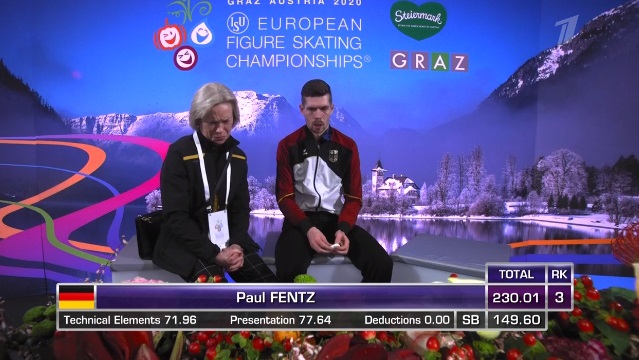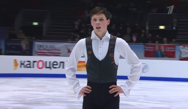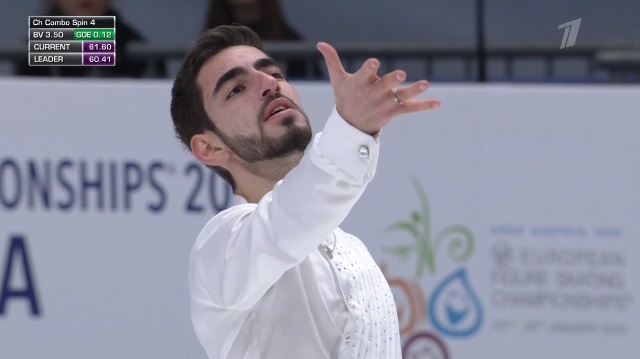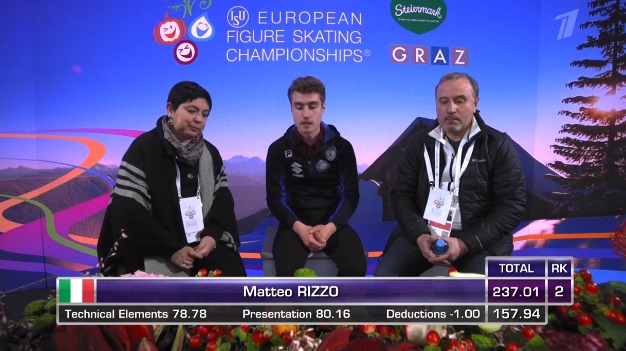 Сразу же неудачный тройной аксель, а вот тройной риттбергер в порядке. Зато не лучшее приземление на тройном лутце, неплохой тройной аксель. Дорожка шагов у него на четвертый уровень, во второй части программы каскад 3 лутц — 3 тулуп. Не все получилось в прокате, но в целом неплохо для дебюта на чемпионатах Европы.