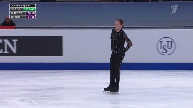 Каскад 3 лутц — 3 тулуп, затем каскад 3 риттбергер — 3 тулуп, каскад 3 лутц — ойлер — 3 сальхов. Одно удовольствие наблюдать за выступлением Грассля сегодня! Завершает дорожкой четвертого уровня и двумя вращениями четвертого уровня. Безукоризненный прокат нового лидера! БЛЕСТЯЩЕ!