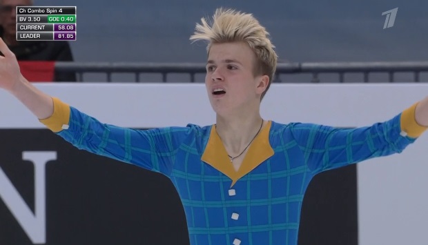 Сразу сделал каскад 3 аксель — 2 тулуп, выполнил каскад 3 лутц — 2 тулуп, не без помарки, но все равно почти чисто исполнил тройной аксель, а вот на тройном флипе приземлился на две ноги. Во второй части программы не очень успешно выполнил каскад 3 лутц — 3 тулуп, затем прыгнул двойной риттбергер вместо тройного, но справился с тройным сальховом. Концовку провел в зажигательной дорожке и вращениях, преимущественно третьего уровня. Для этого спортсмена попадание в произвольную — уже успех, так что прокат вполне неплохой вышел.