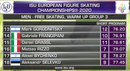 1. Михал Бржезина (Чехия) – 89,77 2. Дмитрий Алиев (Россия) – 88,45 3. Артур Даниелян (Россия) – 84,63 4. Морис Квителашвили (Грузия) – 82,77 5. Денис Васильев (Латвия) – 80,44 6. Поль Фентц (Германия) – 80,41 7. Маттео Риццо (Италия) – 79,07 8. Алексей Быченко (Израиль) – 78,27 9. Александр Селевко (Эстония) – 77,45 10. Габриэле Франгипани (Италия) – 76,91 11. Даниэль Грассль (Италия) – 76,61 12. Марк Городницкий (Израиль) – 76,20 13. Александр Самарин (Россия) – 74,77 14. Николай Майоров (Швеция) – 74,39