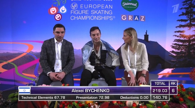 Начинает с четверного тулупа на +2,04. Затем делает каскад 3 аксель — 2 тулуп, где сумел устоять на первом прыжке, доборовшись. Каскад 3 лутц — 3 риттбергер. Сольный тройной риттбергер. Во второй части программы на руку приземляется с тройного акселя, делает каскад 2 флип — ойлер — 3 сальхов, но тоже с неудачным приземлением. Еще двойной флип прыгнул. На дорожке ему дали третий уровень. Явно устал Быченко к концу программы и несколько сдал.