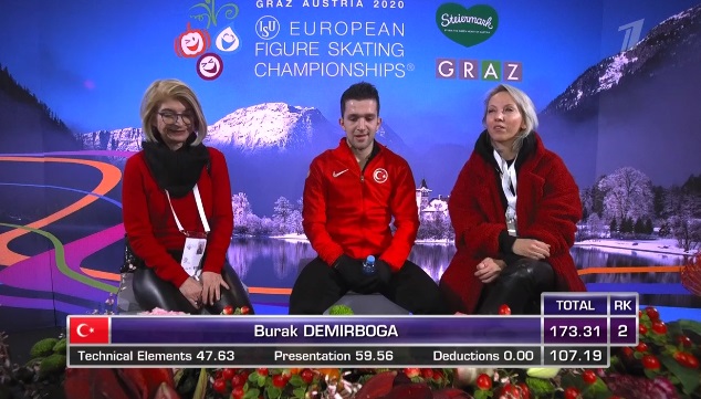 Упал с тройного лутца. Каскад 3 флип — 2 тулуп сделал, ошибка на приземлении с тройного флипа, из-за чего не вышло каскада. Потом сделал сольный тройной флип, тройной сальхов. Двойной аксель тоже не получился чистым. В общем, наляпал ошибок. Совсем не получился прокат у турка.
