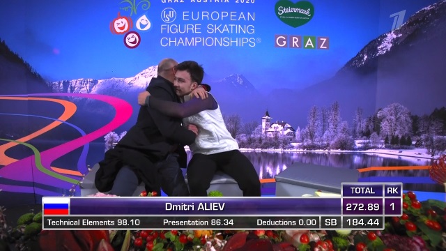 А теперь на льду еще один россиянин. Дмитрий Алиев был вторым после короткой программы.