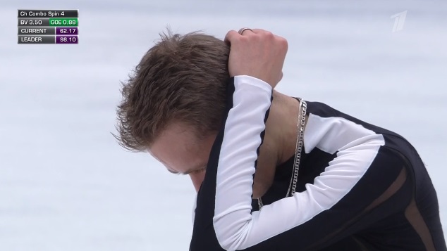 Сразу же падение с четверного лутца, затем сделал двойной аксель, потом прыгнул тройной риттбергер, но с ошибкой на приземлении. Во второй части каскад 3 лутц — 2 тулуп, двойной флип — все не очень удачно. Как и каскад 3 флип — ойлер — сальхов, где получился только оборот в последнем прыжке. Многовато всего сорвал.