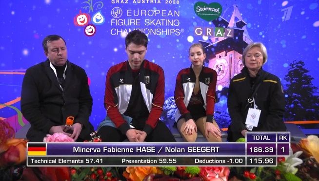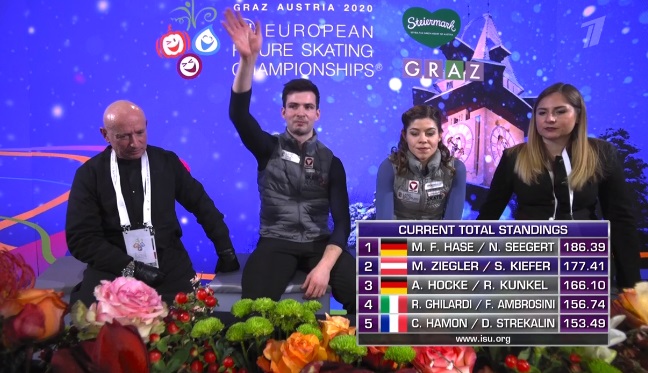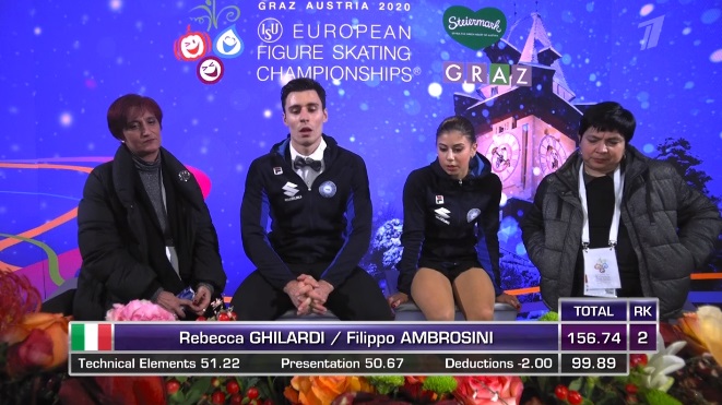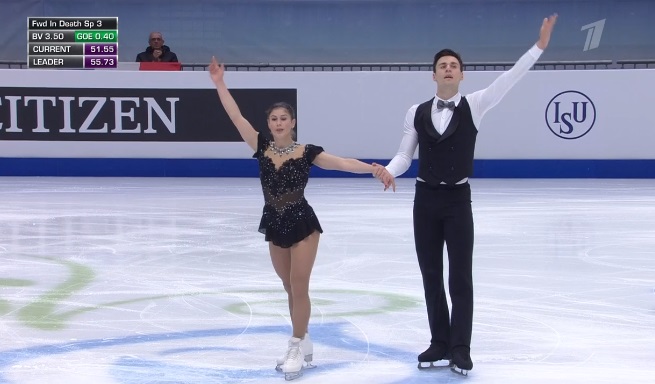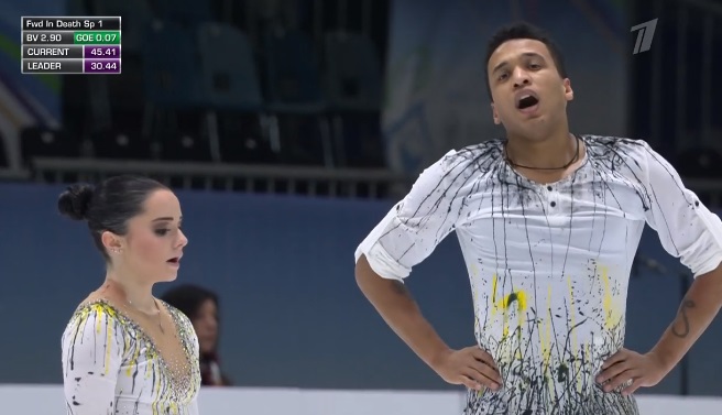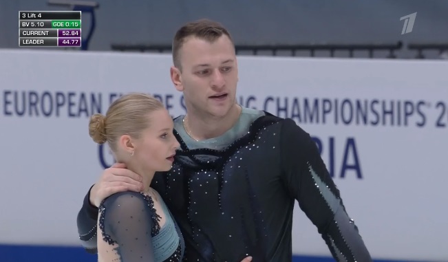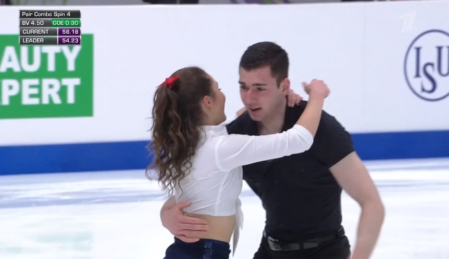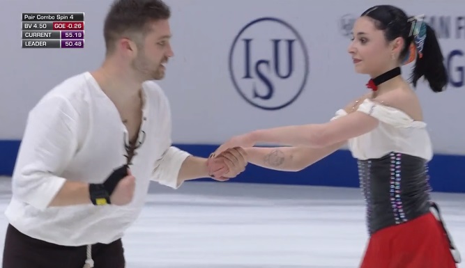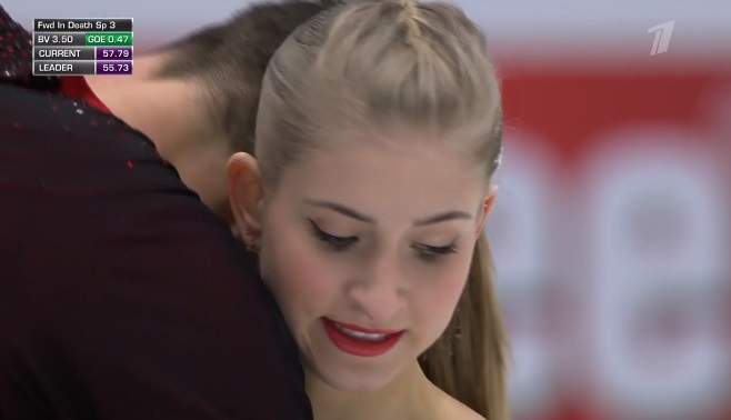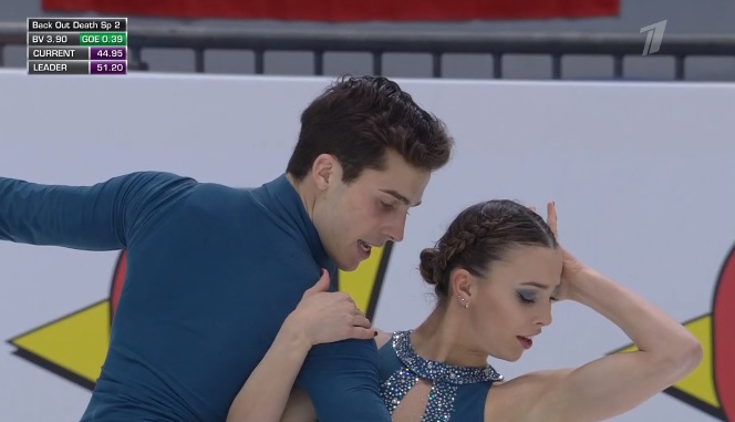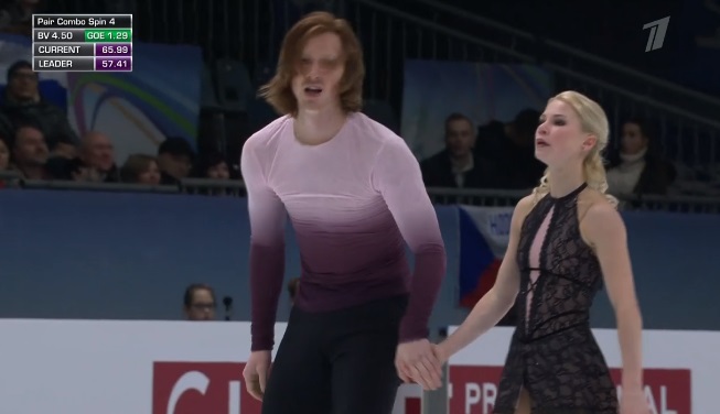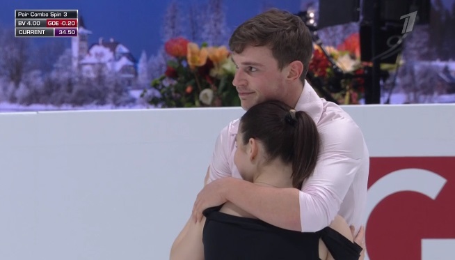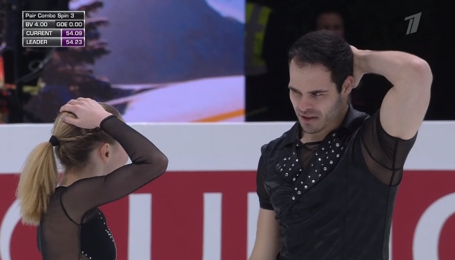 Очень приличный прокат. Не обошлось без ошибки, конечно — на выбросе тройной риттбергер на две ноги приземлилась партнерша, но не упала все-таки. А так, приличный прокат, хотя недочеты все равно были. Но, кажется, уверенно обойдут лидеров!