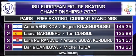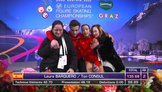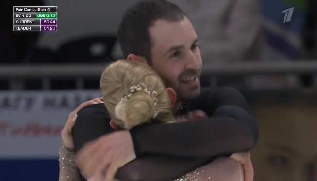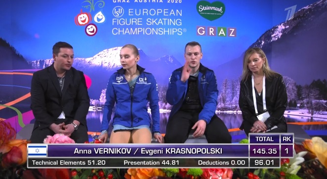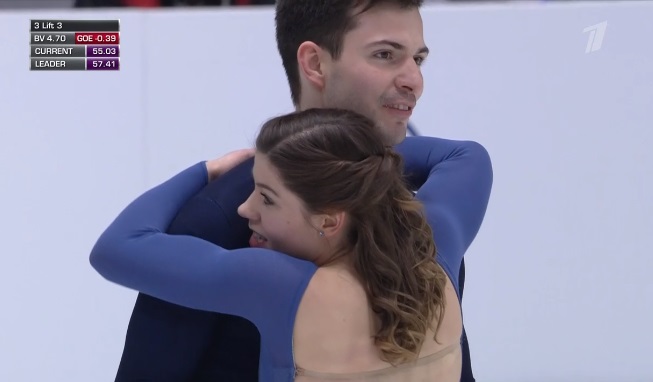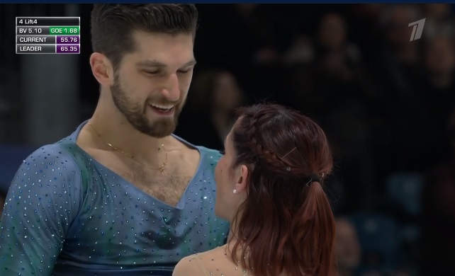 Ну что, просто отличный прокат. Хорошие выбросы, поддержки, вращение. Разве что с одного выброса партнерша упала. По уровню это, похоже, лучший пока прокат на сегодня. Ну, или израильтяне поборются. Посмотрим на оценки.