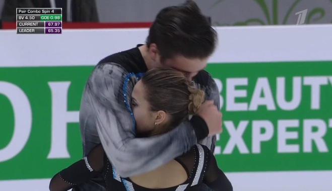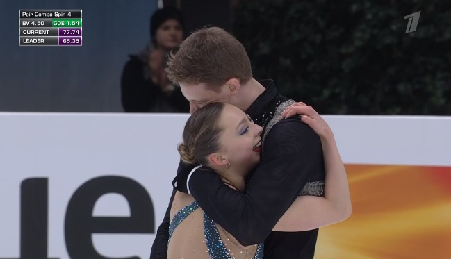 Чемпионы России этого сезона начали с чистейшего параллельного тройного сальхова (+1,72), затем выполнили каскад 3-2-2 из тулупов (+0,78), подкрутка третьего уровня изящна и чиста (+1,81), выброс тройной флип прекрасен. Очень приятное впечатление оставляют, как и подобает лидерам. Во второй части программы отлично исполнили выброс тройной риттбергер (+2,07). Ну и напоследок вращение четвертого уровня. ЭТО БЕЗУСЛОВНО ЧЕМПИОНСКИЙ ПРОКАТ!