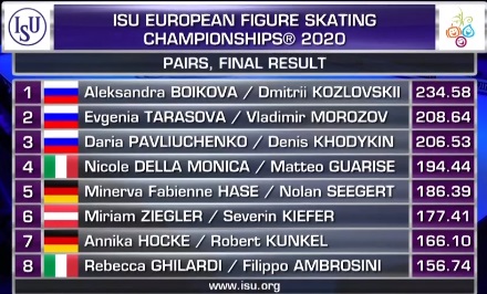 1. Александра Бойкова – Дмитрий Козловский (Россия) – 82,34 2. Дарья Павлюченко – Денис Ходыкин (Россия) – 74,92 3. Евгения Тарасова – Владимир Морозов (Россия) – 73,50 4. Николь Делла Моника – Маттео Гуаризе (Италия) – 70,48 5. Минерва Фабьен Хазе – Нолан Зеегерт (Германия) – 70,43 6. Мириам Циглер – Северин Кифер (Австрия) – 67,90 7. Анника Хокке – Роберт Кункель (Германия) – 58,43 8. Ребекка Гиларди – Филиппо Амброзини (Италия) – 56,85