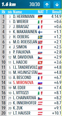Отсечка 0,8 км: лидирует Херманн, за ней Ройселанн и Вирер. Лучшая из россиянок — Миронова — 16-я.