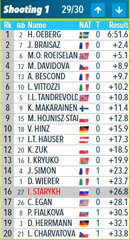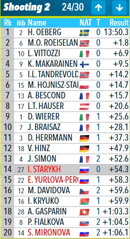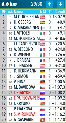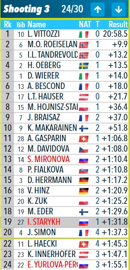 У Старых один промах, у Юрловой чистый рубеж. В итоге после последней стрельбы Миронова, Старых и Юрлова-Перхт убежали 19-й, 20-й, и 21-й соответственно.