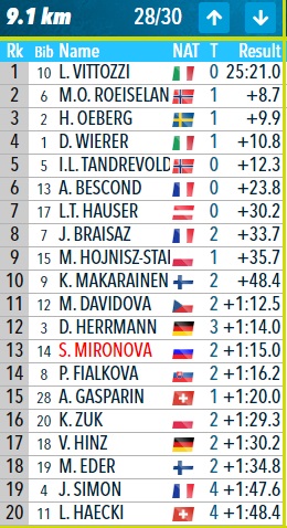 Лучшей из промахнувшихся по разу спортсменок бежит обладательница Большого хрустального глобуса итальянка Доротея Вирер, отстающая на 24 секунды. Она на 12-м месте.