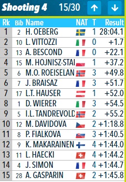 Мажет Оберг, мажет дважды Мякарайнен. Зато чисто работает и убегает лидером Витоцци! За ней Ройселанн и дальше Тандреволд, Оберг и Вирер.