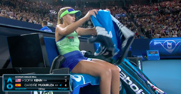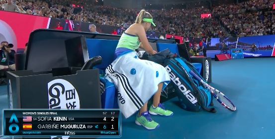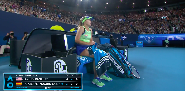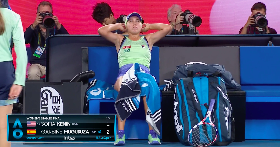 Софья взяла гейм и сделала счет в первом сете 3:4 — Мугуруса по-прежнему впереди. Досмотрев за полетом мяча в сетку после удара Гарбинье, американка сразу же бросилась на скамейку для отдыха — перерывы в теннисе очень короткие.