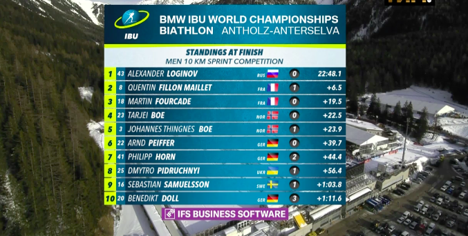 ДА! ЛОГИНОВ ФИНИШИРУЕТ С ЛУЧШИМ ВРЕМЕНЕМ! Фийон-Майе — второй (+6,5 секунды), Фуркад — третий (+19,5), Тарьей Бё — четвертый (+22,5), Йоханнес — пятый (+23,9).