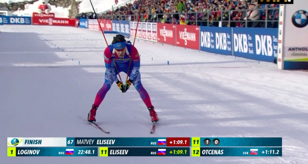 Елисеев безупречно провел стрельбу стоя и ушел на трассу девятым (+31,8 секунды от Логинова).