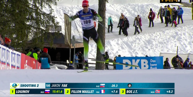 Фийон-Майе тем временем продолжает творить что-то невероятное! На отметке 9,6 км он обгоняет Йоханнеса на 12,3 секунды! А ведь у обоих есть по промаху — никакого дополнительного преимущества у француза перед норвежцем нет.