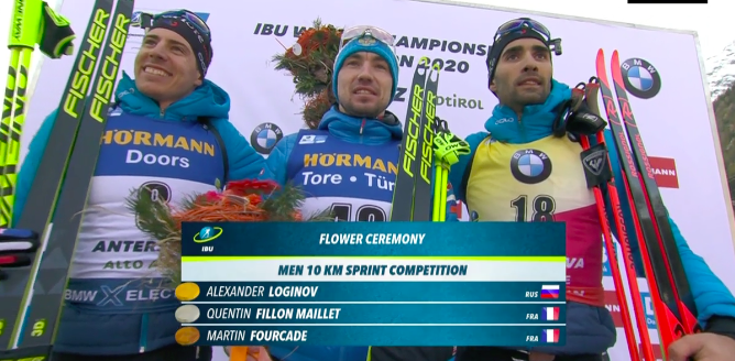 Congratulations to the top 3 in the #antholz2020 men sprint! Alexander Loginov wins, Quentin Fillon Maillet and Martin Fourcade Watch the race again on https://t.co/MSJYx30KUx pic.twitter.com/MHHE3c29ex