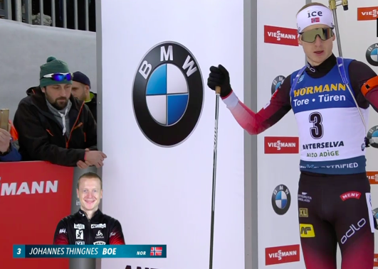 В гонке Йоханнес Бё! Трибуны сходят с ума, приветствуя лидера современного мужского биатлона.